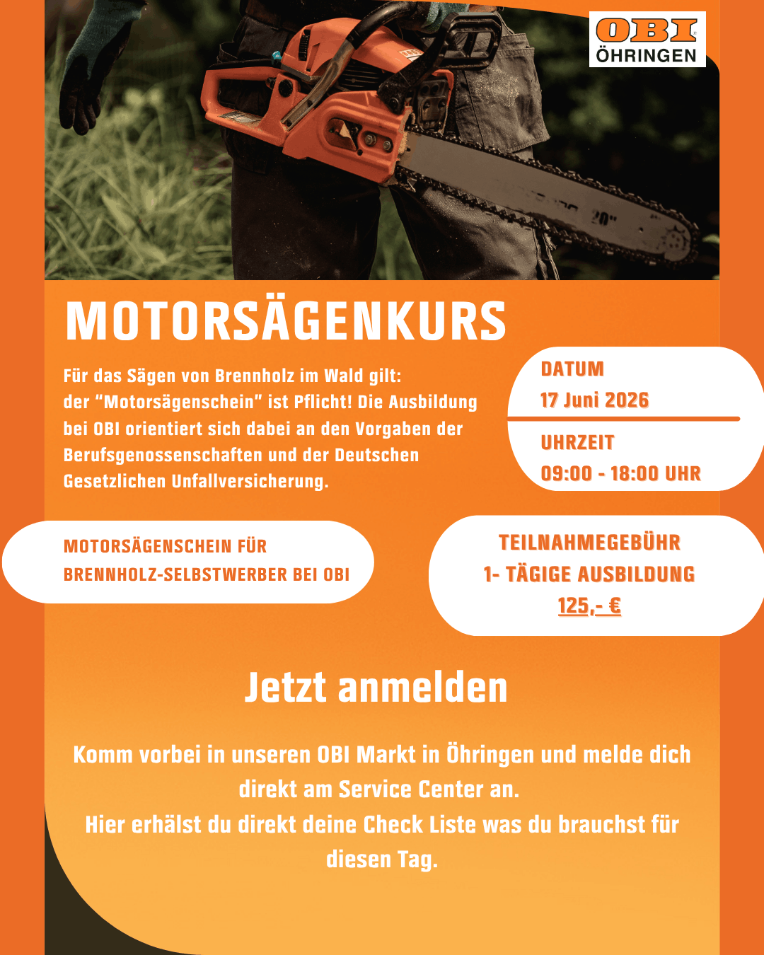 Bist du bereit dein nächstes Outdoor-Projekt wie ein Profi in Angriff zu nehmen? Nimm an unserem umfassenden Kettensägenkurs teil! Mit praktischer Anleitung und Sicherheitstipps von unseren erfahrenen Ausbildern lernst du, wie du eine Kettensäge sicher und effizient bedienst und eine Vielzahl von Aufgaben bewältigen kannst. Unser eintägiger Kurs kostet dich 125€ – melde dich direkt in deinem OBI Markt an!